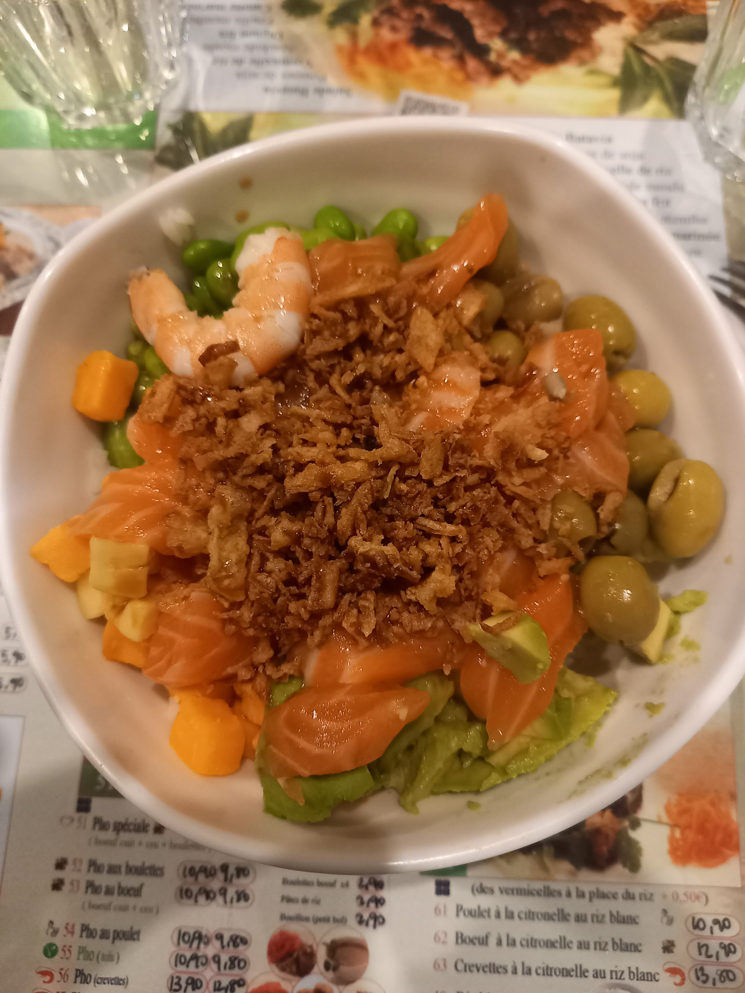 Rice bowl riz brun avec le saumon et de l'avocat, c'était magnifique ! Et le bo bun crevettes nems crevettes est incroyable N'hésitez pas une seconde, pour un prix avoisinant 12-16€, ça en vaut vraiment le coup Ils sont par dessus tout très chaleureux et échange volontiers avec vous Je recommande vraiment !