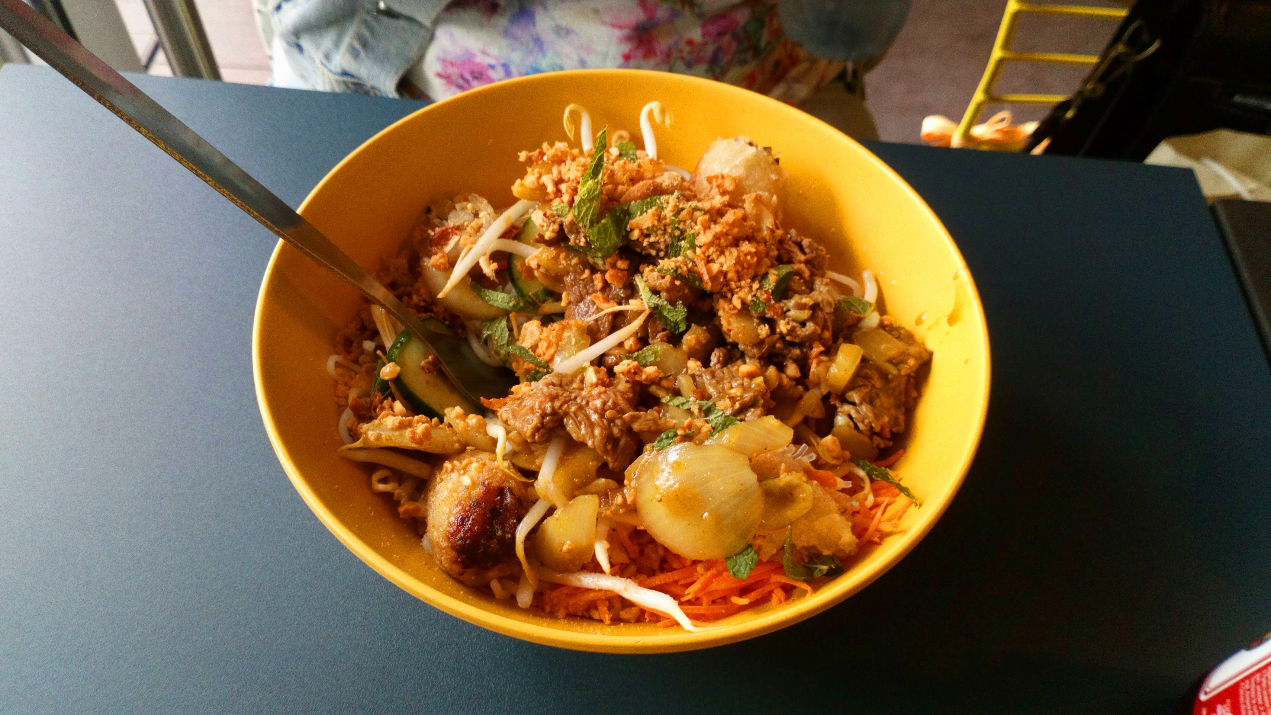 Petit fast food asiatique très populaire (plein de monde donc pas fait du tout). Manger viêt et bien mais plus grand-chose de vietnamien en fait. Bof…
